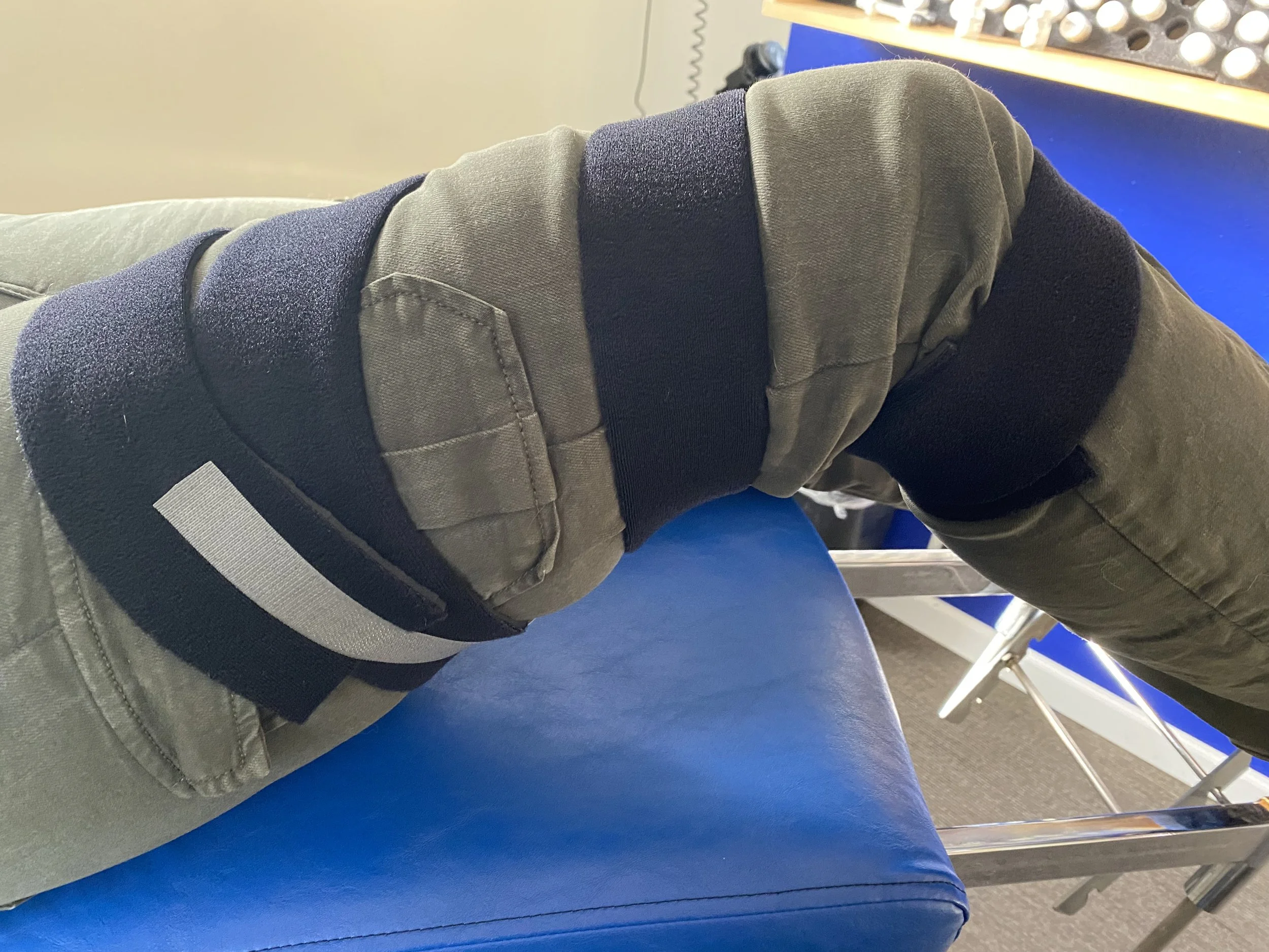 This support seen above may also be best as an initial support but often not. Try it if the first care cast support does not work! The Same starting position of band below the knee cap then spired upward.